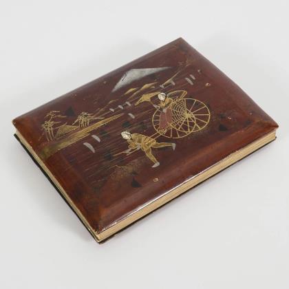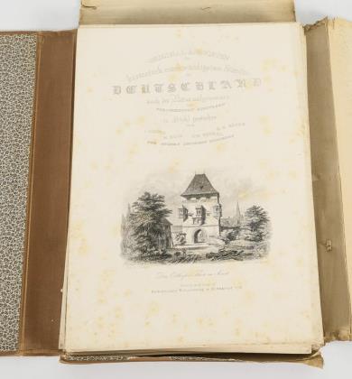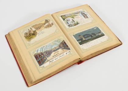 Ca. 480 Karten, die alle an eine Adresse in Magdeburg gelaufen sind. Teils Chromolithografien, teils geprägt. Zumeist Genrebilder (häufig nach Gemälden), Tier- und Kinderdarstellungen, idyllische Landschaften, Blumen, einige Stadtansichten, wenige Schauspieler- und Dichterporträts. Lindgrüner Ledereinband, auf dem Deckel mit Goldprägung und eingelassener Farblithografie
