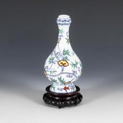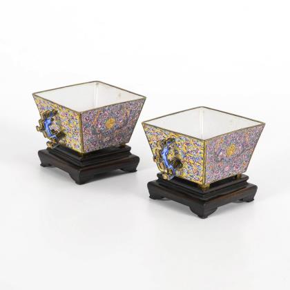 Sehr filigrane, polychrome Bemalung mit zentralem shu-Zeichen, flankiert von Phönixen zwischen Blumenranken. Seitlich stark stilisierte Drachengriffe auf gelbem Untergrund mit Wolkenornament. Innen weiß emailliert, mit kleinem Blumenstück und Fledermaus. Mit Resten von Vergoldung an den Kanten, jüngere Holzsockel