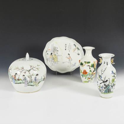 Kleine Balustervasen mit Kranich- und Elsterdarstellung. Dose mit drei Frauen in einem Garten, Chip am Deckelknauf. / Platte mit geschwungenem Rand. Dame mit Dienerinnen bekommt drei Pfirsiche gebracht. Alle mit Schriftblöcken