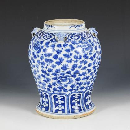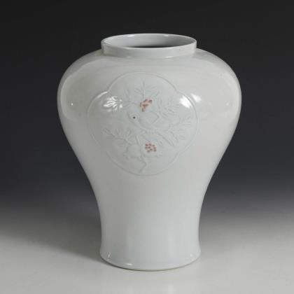 Balustervase mit weißer Glasur. Zwei Flachreliefs mit Vogeldarstellungen, dabei dezente Rotfärbung der Päonienblüte und des Granatapfels