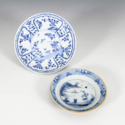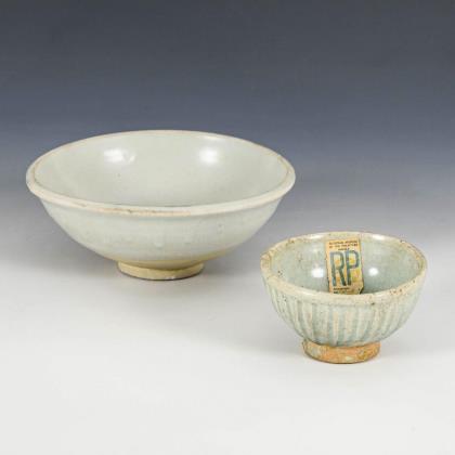 Kleine Schale mit vertikalen Rillen, Siam, 14.-15. Jahrhundert, mit Ausfuhrmarke des "National Museum of the Philippines, Manila", Glasurfehler und ein alter Chip, Ø 10 cm. / Graue Seladonschale mit unglasiertem, aber glattem Fuß, unscheinbarer Glasurriss. Ø 17 cm