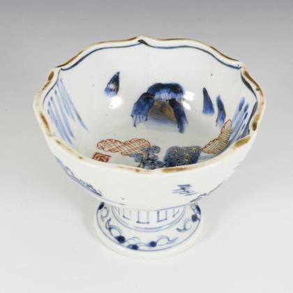 Hoher Fuß mit kleiner, gewellter Schale. Gemarkt mit "Hi" Zeichen für die Provinz Hizen. Landschaft in Unterglasurblaumalerei mit Rot und Goldfarbe. Randvergoldung stark berieben