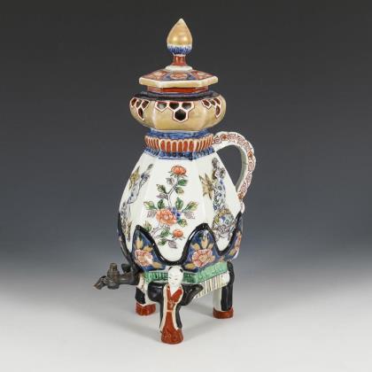 Imari Porzellan. Auf drei figürlichen Füßen stehende Kanne mit kleinem Messinghahn. Die sechskantige Wandung ist reliefiert und farbig gefasst in Unterglasurblau und polychromer Bemalung, mit Darstellungen von Blumen und Fabelwesen. Oberer Rand doppelwandig, mit wabenförmigen Durchbrüchen