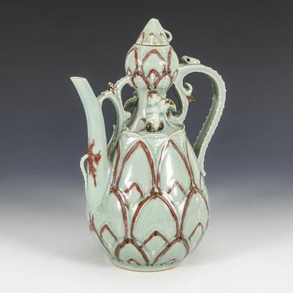 Einer Pflanze nachgeformtes Gefäß mit Seladonglasur, fein krakeliert. Henkel und Tülle durch feine Ranken und Blattwerk verbunden