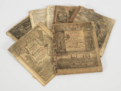 "Pirnaischer Chronicken-und Historien Calender" 1800. / 2 Fragmente 1805 und 1812 / "Stolpischer Haushaltungs- Wirthschafts- und Geschichtskalender" 1809. / "Budissiner historischer Schreibkalender" 1839, mit "6 Pfennig Kalenderstempel" und für 1817, 1857, 1873, 1874 / "Gottfried Hoffmanns ... Haus- und Wirthschaftskalender" Budissin 1841. / "Pirnaischer Oeconom Haushaltungskalender 1863" / "Stolpenscher Chronicken und Historien Calender" 1813 / "Meissner gemeinnütziger und unterhaltender Calender" 1859. In moderner Fächermappe