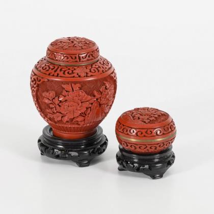 Deckelvase und Dose mit tiefem, floralem Reliefmuster. Beide mit Holzsockel