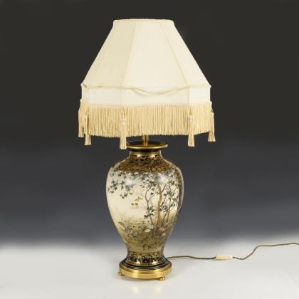 Balusterkorpus mit Messingmontierung, in sehr feiner Bemalung, Glasur sehr fein krakeliert. Zwei große Bildkartuschen mit idealisierten Naturdarstellungen, Rebhühner bzw. Enten unter blühenden Bäumen. Wandung mit filigranem, goldfarbenem Blütenmuster auf kobaltblauer Glasur. Elektrik nicht überprüft