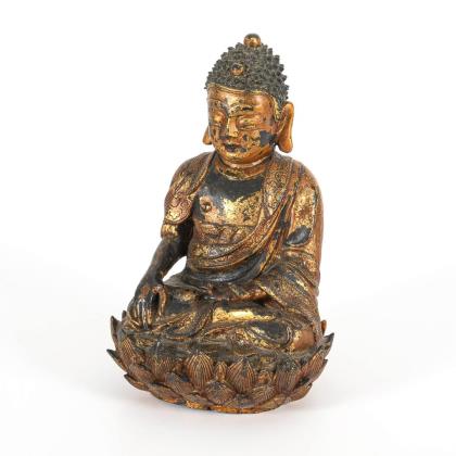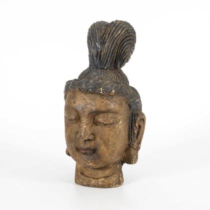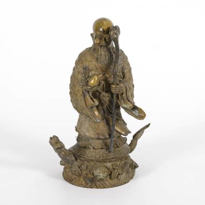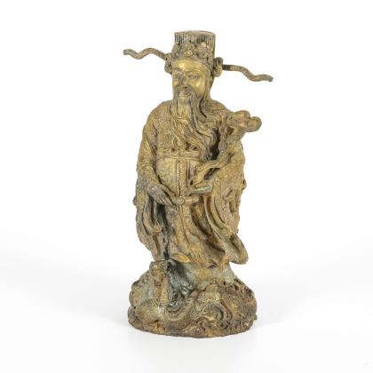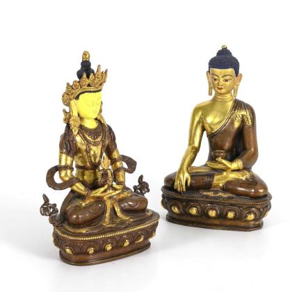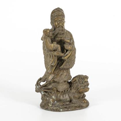 Guanyin auf hohem Sockel, eine Vase in der Hand haltend, hier kleine Fehlstelle. H 26 cm. / Heiliger mit Kinderfigur, Gewandränder dunkel gefärbt. H 18.5 cm