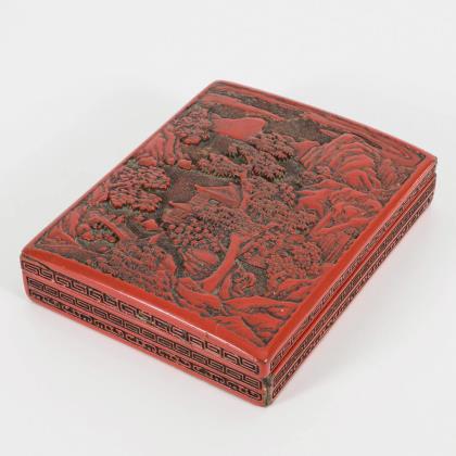 Rechteckiger Korpus mit idealisierter Seelandschaft, umgeben von Bergen und Bäumen. Seitlich umlaufendes Mäanderornament. Innen schwarz lackiert