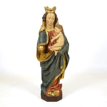 In spätgotischer Form gestaltete Maria im faltenreichen Gewand, die auf ein Gesicht tritt und damit als Immaculata erscheint. Während sie in ihrem linken Arm das nackte Jesuskind trägt, hält sie mit der Rechten einen vergoldeten Apfel vor es hin