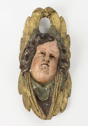Zur Seite strebender, großer Engelskopf mit vergoldeten Flügeln. En face gestaltete frühbarocke Engelsflüchte
