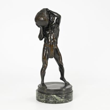 Der nackte Schwertkämpfer im kraftvollen Ausfallschritt. Nach dem antiken Original im Louvre hier wieder in Bronze gegossen, jedoch mit Feigenblatt