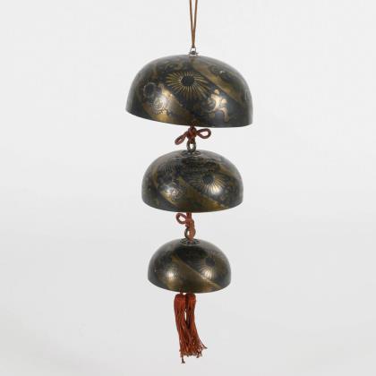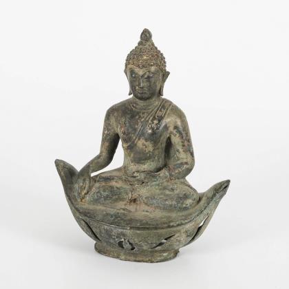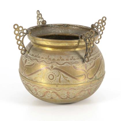 Messingkessel mit Kupfereinlagen und gepunzter Musterung. Aus zwei Teilen gefertigt, mit vier verzierten Aufhängeösen