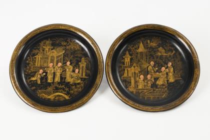 Paar kleine Lackteller mit Chinoiserien in Goldmalerei.