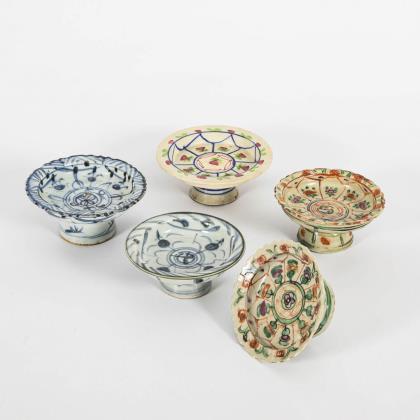 Verschieden gestaltete Schälchen, Füße teils unregelmäßig, einfach produziert. Die blau-weißen dekorierten Stücke wohl China, Ming Dynastie, Swatow-Ware. / Farbige Teile wohl Siam, 14.-15. Jahrhundert
