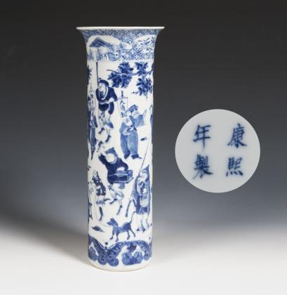 Kobaltblaue Unterglasurbemalung, umlaufend reiches figürliches Dekor mit tanzenden und musizierenden Figuren und anderweitig beschäftigten Personen. Am Ansatz Schmetterling-Bordüre, an der Mündung Mosaik-Bordüre mit vier Landschafts- und Blütenreserven. Unterglasurblaue Vierzeichenmarke