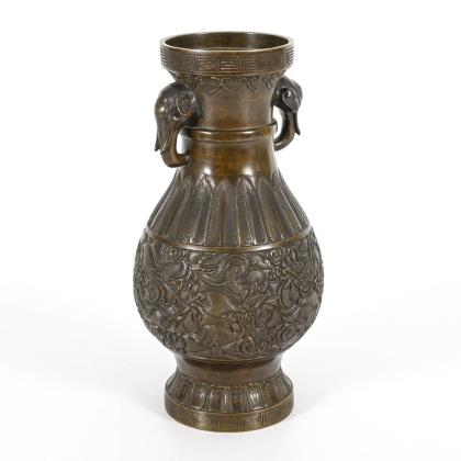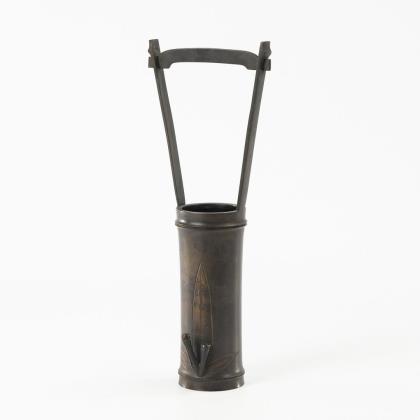 Hohes Gefäß in Form eines Bambus-Abschnittes mit gravierten Bambusblättern und vollplastischen Bambus-Ansätzen sowie hohem Henkel