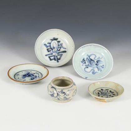 Chinesisches Porzellan als Export für die Philippinen, Swatow-Ware. 4 kleine Teller und ein Schüsselchen in Unterglasurblaumalerei, eines mit Schriftzeichen, sowie Fabelwesen und Blumenranken