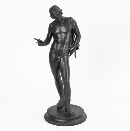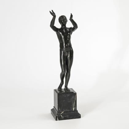 Mit erhobenen Händen stehender Adorant. Nach der berühmten antiken Bronzefigur, die Friedrich II. vor seinem Arbeitszimmer in Sanssouci aufstellen ließ und man glaubte, Antinous in ihr zu erkennen. Heute steht die antike Bronze im Alten Museum von Berlin