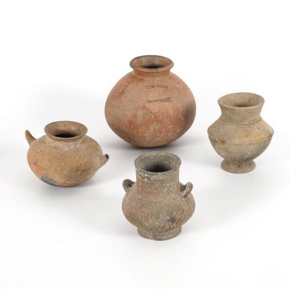 Großes Kugelgefäß: Laguna Typ, Ming Zeit, H 21 cm. / Gefäß mit Tülle und einer Handhabe: Calatagan Typ, 14./15. Jahrhundert. H 11,5 cm. / Gefäß mit zwei Henkeln und Ritzmuster, im Standring zwei Löcher: Eisen-Zeit, Sigogon Typ, circa 200 vor bis 900 nach Christus. H 14 cm. / Gefäß mit ausgestelltem Rand: Batangas Typ, circa 200 vor bis 900 nach Christi, H 16 cm