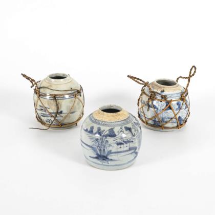 Aus verschiedenen Werkstätten stammende Töpfe mit stilisierten Landschaften. Einer in kräftigem Blau, mit komplettem Bastgeflecht. Zwei andere Töpfe mit Haarrissen und Bastgeflecht defekt