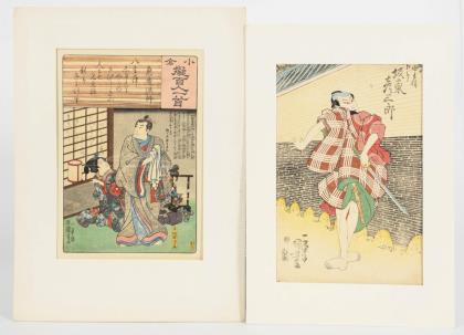 "Der Schauspieler Bandô hikosaburô mit Schwert", ca. 1840. / Gedichtsammlung der 100 Dichter des 7.-13. Jahrhundert, Blatt 47, Gedicht des Ekei Hoshi, 1843/45, Abzug der Zeit. Beide im Passepartout, mit Zuschreibungen