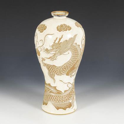Schlanke Form mit unglasiertem Flachrelief zweier Drachen mit Kugel