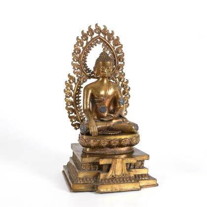In barocker Art kissenförmig gebauchter Sockel mit Akanthus-Appliken und Titel-Frontkartusche