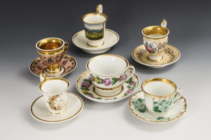 6 verschiedene Tassen (darunter Ludwigsburg, Krister, Paris). Überwiegend Blumenmalerei, 1x mit der Ansicht von Schaffenried