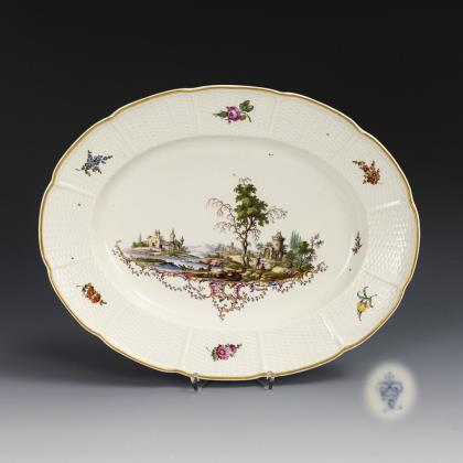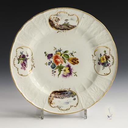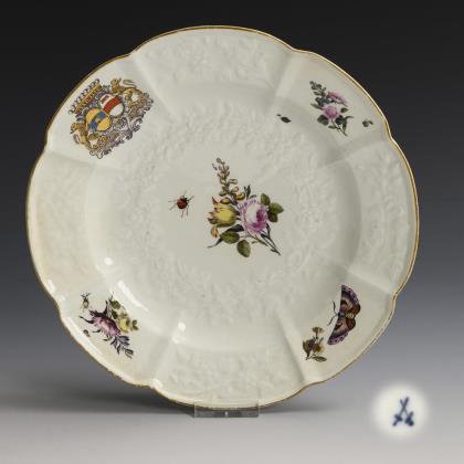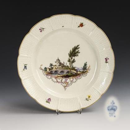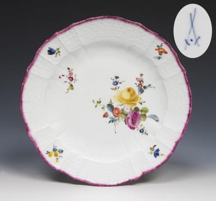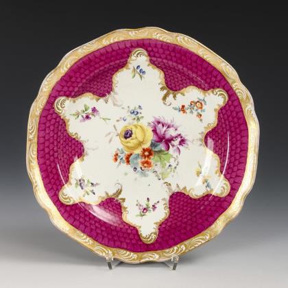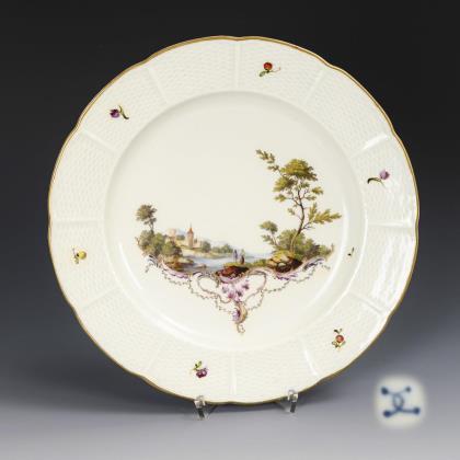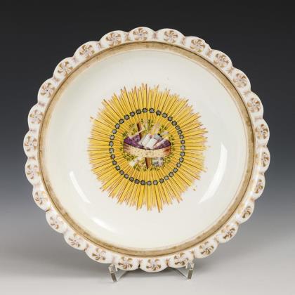 Dessertteller mit korbdurchbrochener Fahne, im Spiegel ein fünfpassig gelegtes Schleifenband mit Blumen und Blattranken