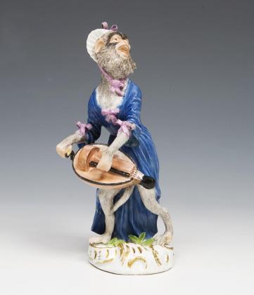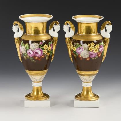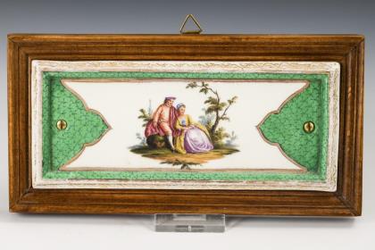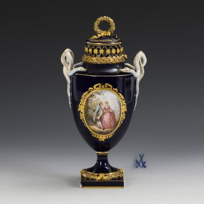 Ovoider Korpus mit zwei Schlangenhenkeln, durchbrochenem Deckel mit Eichenlaubgriff und Rundfuß mit umgelegtem Eichenlaubkranz und Quadratplinthe. Kobaltfond, beidseitig ein ovales Medaillon mit galanten Paaren in einer Parklandschaft