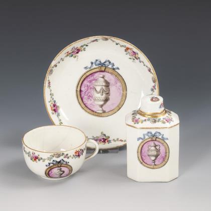Rechteckige Dose mit angeschnittenen Ecken und Deckel sowie Tasse mit originaler Untertasse. Alle bemalt mit einem schleifenbekrönten Medaillon und Blumenfestons