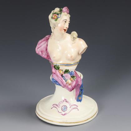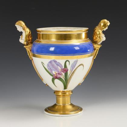 Ovoider Korpus mit den Halbfiguren zweier Frauen als Handhaben, Rundfuß. Unter einem blauen Fondband die Darstellung einer Iris bzw. von Nelken, unterseitig französisch bezeichnet. Ohne Deckel