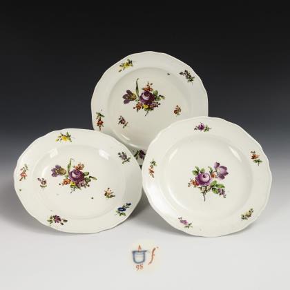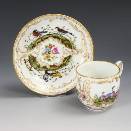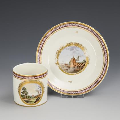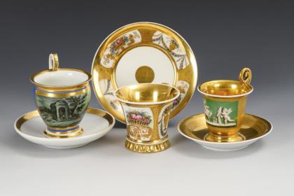 1x Kratertasse mit originaler Untertasse: auf der Wandung goldgemalte Blumenkörbe und -vasen mit bunten Blumenbuketts. / 1x Wien, 1836: gefußte Glockentasse mit Rosettenhenkel und ergänzter Untertasse; mit blauem Fond, schauseitig eine goldgerahmte Kartusche mit der Darstellung einer Nachtlandschaft mit einer rastenden Familie vor einer Pietá. / 1x gefußte Glockentasse mit Schwanenhalshenkel und ergänzter Untertasse: Goldfond, schauseitig eine Rechteckkartusche mit einer grisaillegemalten Puttendarstellung vor grünem Fond