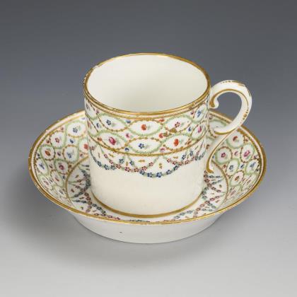 Zylindertasse mit Ohrenhenkel. Auf der Wandung über sich überschneidenen Blütenfestons Streublümchen in grünen und goldenen Blattranken