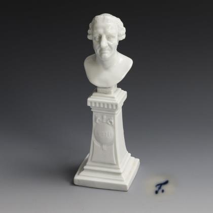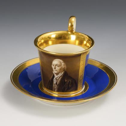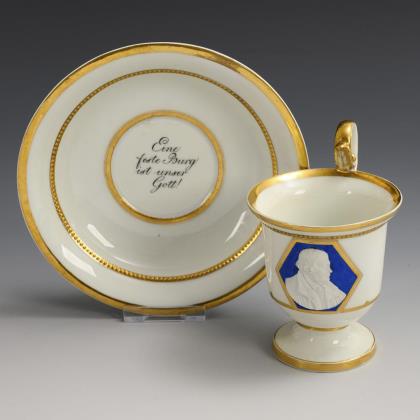 Gefußte Glockentasse mit Perlband und Rocaillehenkel. Schauseitig eine hexagonale Kartusche mit blauem Fond und dem Biskuitrelief von Martin Luther (1483-1546), im Spiegel der Untertasse der Spruch "Eine feste Burg ist unser Gott!"
