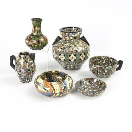 6 Art-déco-Keramiken mit Mosaikdekor. Jean Gerbino, Vallauris.