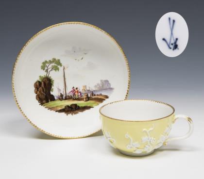 1x Schwertermarke mit Punkt, 1763-1774: bauchige Tasse mit Ohrenhenkel und schleifenbekrönten Blumenfestons (H Tasse 4,5 cm, Ø originale Untertasse 13,5 cm). / 1x Knaufschwerter mit grünem Beizeichen "I", 1816-1824: Zylindertasse mit gewinkeltem Henkel und einem schauseitigen Blumenbukett (H Tasse 6,5 cm, Ø originale Untertasse 13,5 cm)