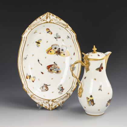 Birnkanne mit alt ergänztem, aufwändig gearbeitetem Henkel, Deckelmontierung und Knauf aus Bronze. / Ovale Schale mit zwei blattreliefierten Handhaben. Beide mit Schmetterlingsdekor mit Insekten und goldenen Streublümchen