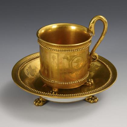 Zylindertasse mit Perlbändern, drei Tatzenfüßen und Schwanenhenkel. Goldener Fond mit radierten Symbolen