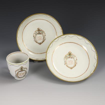 Bauchige Tassen mit Asthenkel. Auf Tasse und Untertasse der aus einer Blumengirlande geformte Buchstabe "G" bzw. "S"