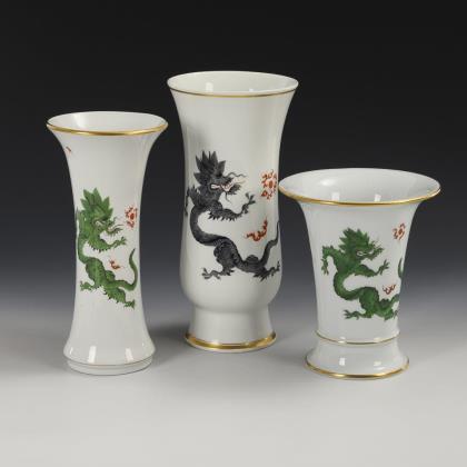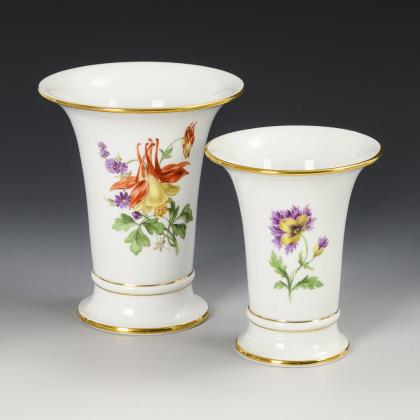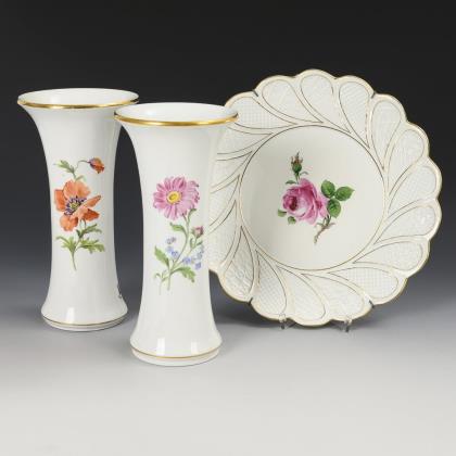 2 Flötenvasen und 1 Fächerplatte mit Blumenmalerei. Meissen.