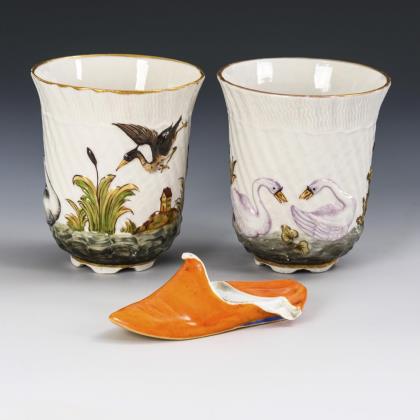 2 Becher mit Schwanenservicerelief und 1 Zierschuh.