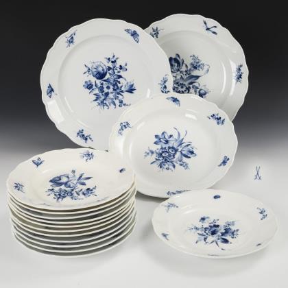 12 Teller und 3 Platten mit Blaumalerei. Meissen.