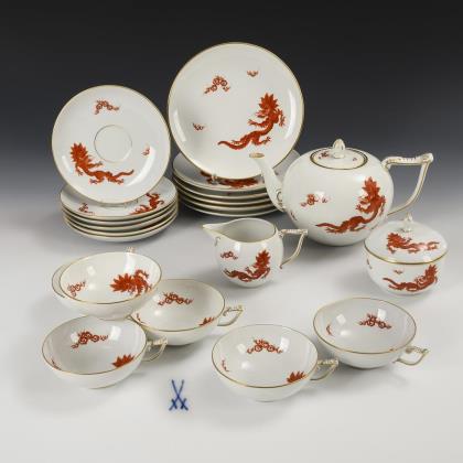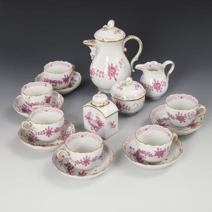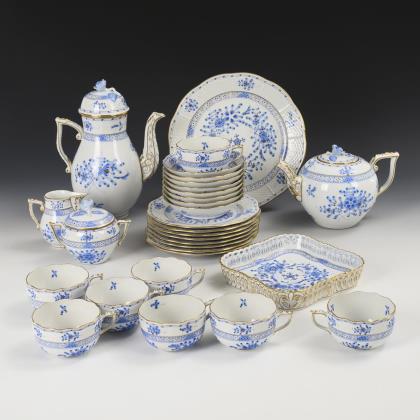 35 Teile. Form "Altozier". Kaffeekanne (H 25,5 cm), Teekanne (H 14 cm), Milchkännchen, Zuckerdose, 8 Teetassen, 8 Untertassen, 8 Frühstücksteller, 4 Eierbecher, 1 Tablett (L 28 cm), 1 Körbchen (Ø 9 cm) und 1 Herzdöschen (L 7,5 cm)