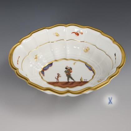 Ovale, mehrpassige Schale, im Spiegel die Darstellung eines Harlekins mit Hund