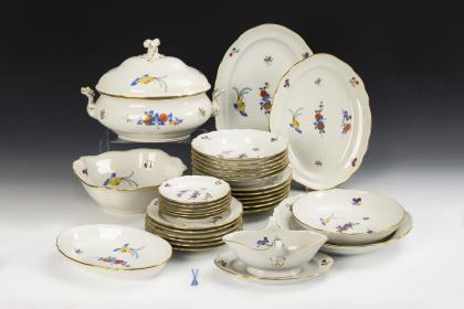 Überwiegend Form "Neuer Ausschnitt". 6 Suppenteller, 6 Speiseteller, 1 Ovalplatte (L 42 cm), 1 Deckelschüssel (Ø 26 cm), 1 Sauciere (L 22 cm) und 1 Schale (Ø 25 cm)