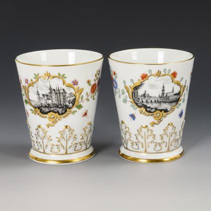 Konische Becher mit Akanthusblattrelief am Stand. Schauseitig einer Rocaillekartusche mit der grisaillegemalten, bezeichneten Ansicht von Dresden bzw. der Albrechtsburg in Meißen