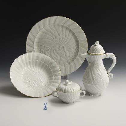 Kanne, Zuckerdose, Teller und Platte mit Schwanenservice-Dekor. Meissen.
