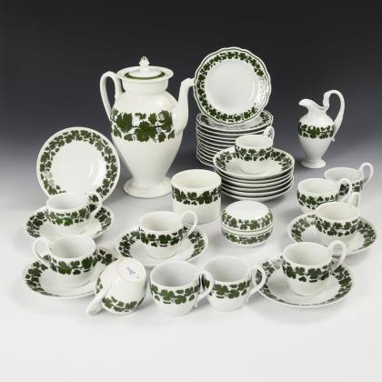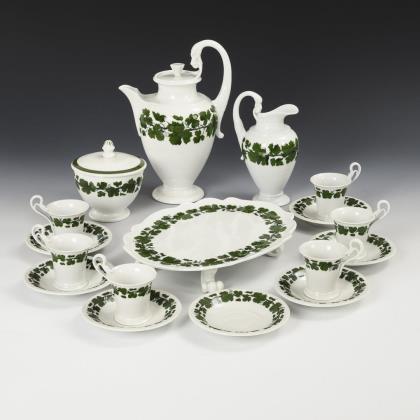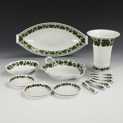 Form "Altozier". 8 Kaffeetassen mit 8 Untertassen, 6 Kuchenteller, 1 Mokkakanne, 2 Milchkännchen (H 8 und 9,5 cm), Zuckerdose, 8 Nussschälchen (Ø 9,5 cm), 2 Ovalplatten (L 23,5 und 36,5 cm), 1 Rechteckplatte (L 27,5 cm), 1 ovaler Korb (L 26,5 cm), 1 Kuchenplatte (Ø 32,5 cm), 1 Tafelaufsatz mit Delfinfuß (H 9,5 cm), 1 Blattschale (L 20 cm), 1 Blattschälchen (L 10,5 cm), 1 Cremetöpfchen, 1 Kraterväschen (H 7,5 cm), 3 Vasen (H 13,5, 8,5 und 6,5 cm) und 1 Leuchter (H 12 cm)